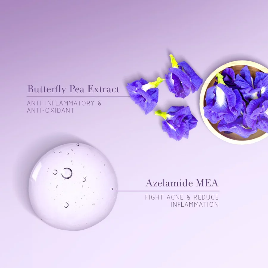 Water, Azelamide MEA, Sodium Hyaluronate, Phenoxyethanol, Sodium Acrylates Copolymer, Lecithin, Carbomer, Triethanolamine, Menthyl Lactate, Polylysine, Lavandula Angustifolia (Lavender) Oil, o-Cymen-5-OL, Ethylhexylglycerin, PPG-26-Buteth-26, PEG-40 Hydrogenated Castor Oil, Inulin, Alpha-Glucan Oligosaccharide, Clitoria Ternatea (Butterfly Pea) Flower Extract, Beta Vulgaris (Beet) Root Extract.
